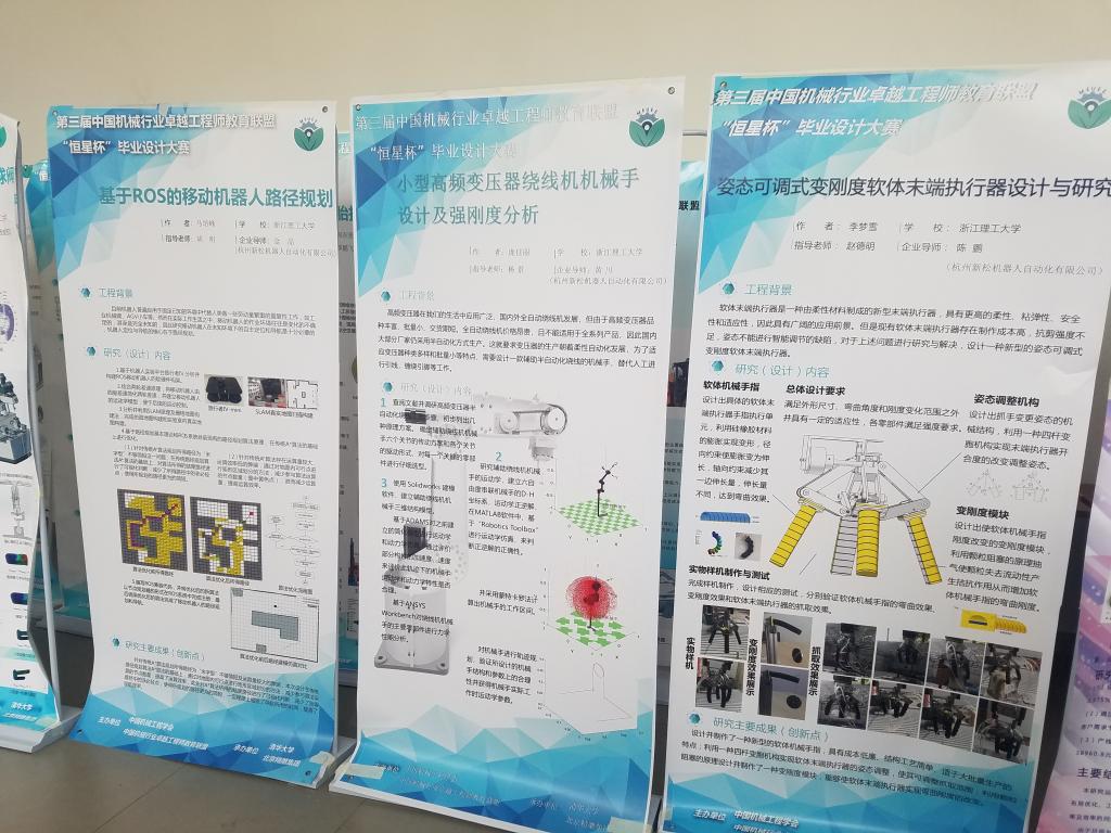 通过正式决赛答辩,李梦雪《姿态可调式变刚度软体末端执行器设计与研究》(校内指导教师:赵德明;企业指导教师:杭州新松机器人自动化有限公司陈鹏)、马培峰《基于ROS的移动机器人路径规划》(校内指导教师:胡明;企业指导教师:金晶)、庞佳丽《小型高频变压器绕线机机械手设计及强度和刚度分析》(校内指导教师:杨景;企业指导教师:黄川)均荣获本届卓越联盟毕业设计大赛佳作奖。指导教师赵德明老师、杨景老师、胡明老师获得优秀指导教师奖。