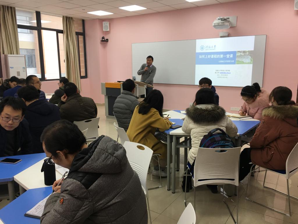 为进一步提高教师的课堂教学能力与业务水平,促进学院教学质量的有效提升,12月21日下午,由校教师教学发展中心主办、机械与自动控制学院教师教学发展分中心承办的“课程教学能力提升计划——如何上好课程第一堂课”在23号楼524-525智慧教室顺利举行。河海大学机电工程学院副院长、江苏省优秀力学教师楼力律老师主讲了此次课程,校教师教学发展中心主任郭江峰、机械与自动控制学院副院长胡明以及学院40多名青年教师参加了本次示范教学活动。