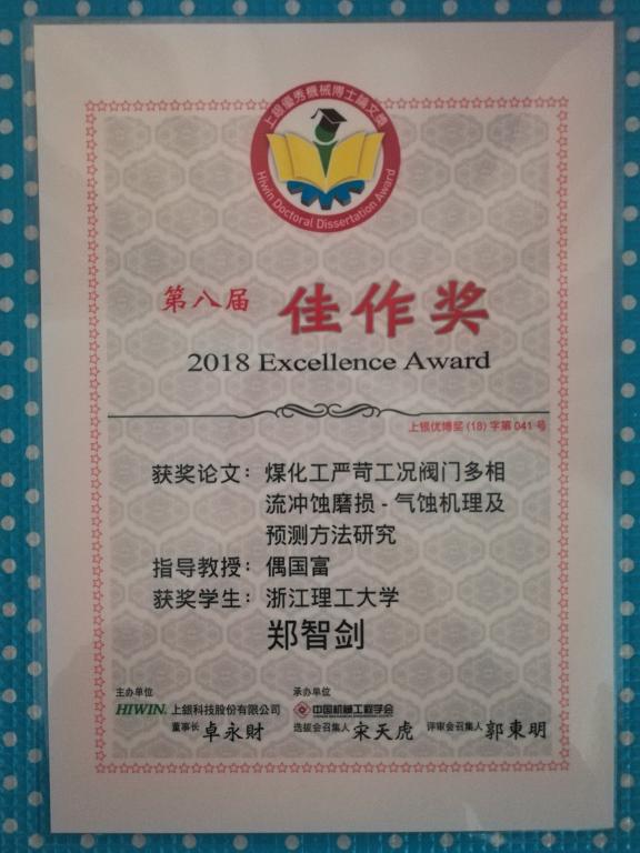 11月8-10日,由中国机械工程学会主办的第八届上银优秀机械博士论文奖颁奖典礼在四川成都新华宾馆隆重举行。我校机控学院博士生郑智剑(指导教师:偶国富)的博士论文“煤化工严苛工况阀门多相流冲蚀磨损-气蚀机理及预测方法研究”获得佳作奖。
