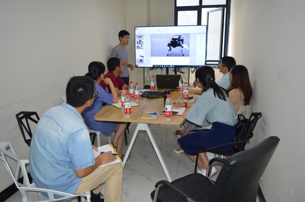 首先,在王兴兴校友的陪同下,潘海鹏一行参观了公司的研发部门及公司备受关注的Laikago四足机器人“网红产品”。王兴兴介绍,这款四足机器人具有强劲的动力性能和运动稳定性。Laikago整机有12个高性能电机,总瞬时最大功率为18KW,功率质量密度0.8KW/Kg,已经可以实现基本上下坡草地、简单的平衡功能并保证运动的稳定性。王兴兴通过设计电机、驱动器及整套控制系统和部分传感器,大大提高了机器人集成度。保证它能在复杂情况下都有保持良好的稳定性。当提到为什么从大疆离职投身创业时。王兴兴谈到因为自己从小就喜欢科技,在研究生期间独立设计的XDog正好被国内外媒体广泛报道,于是就在2016年8月离职,创立了宇树科技。之后从尺寸、体型、动力性能规划出发,按设计需求全新独立研发了电机、电动驱动及主控、整机机械结构以及全新重构的控制系统,打造了全新的四足机器人“Laikago”。