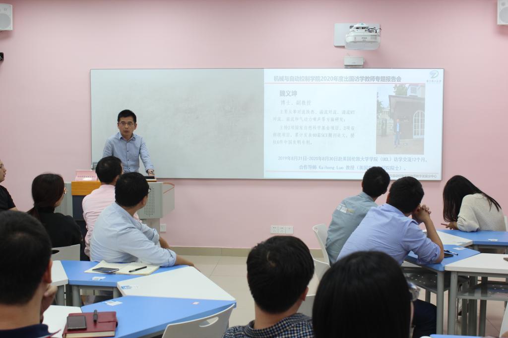 10月13日下午,学院2020年度出国访学教师专题报告会在23号楼大学生创新中心智慧教室成功举行。参加本次专题报告活动、分享访学交流经历的共有6名访学归国的教师,分别是来自机械电子工程系的程晓颖、贺磊盈,能源与动力工程系的宿向辉、魏义坤,测控技术与仪器系的张艳超,和电气工程系的纪科辉老师。专题报告会由学院副院长胡明主持,40余名青年教师参加学习交流。