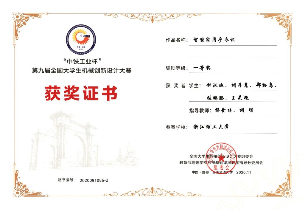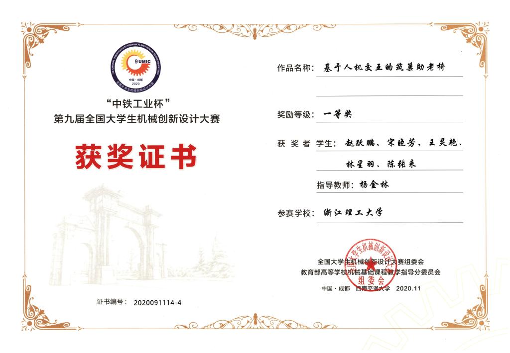 近日,“中铁工业杯”第九届全国大学生机械创新设计大赛决赛在西南交通大学举行。来自全国各赛区的900余名师生齐聚决赛现场。经过激烈的角逐,最终学院“智能家用叠衣机”(团队成员:钟汉迪、胡子慧、郑孙鸟、张鹤腾、王灵艳,指导老师:杨金林、胡明)、“基于人机交互的筑巢助老椅”(团队成员:赵跃鹏、宋晓芳、王灵艳、林星羽、陈张来,指导老师:杨金林)2项作品荣获国赛一等奖,“智医饮”(团队成员:张波、李杰、詹赵锋、胡雄钧、张鹤腾,指导老师:胡明、杨金林)项目荣获国赛二等奖,其中“基于人机交互的筑巢助老椅”获评“最具人气作品”。